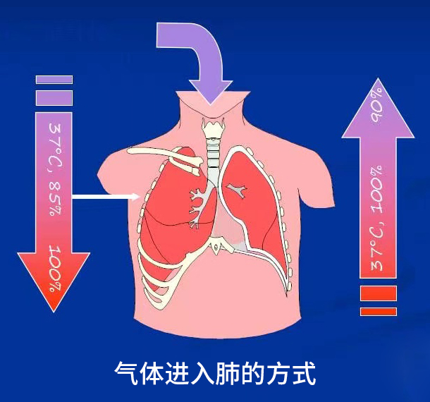 在健康的氣道中,吸氣時,上氣道會對氣體進行加溫濕化。當(dāng)氣體到達肺部時,其溫度為核心體溫并且被水蒸氣充分飽和,也就是典型的,溫度為 37 °C,絕對濕度 (AH) 為 44 mg/L。