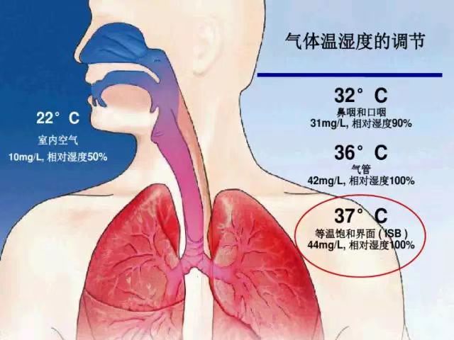 適宜濕度是我們氣道對吸入氣體進行加溫濕化所達到的條件,通常會達到 37 °C 和 44 mg/L H2O (BTPS*)。