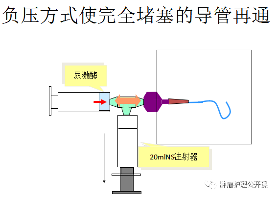 2、根據堵管液體的性質(的 沉積、脂肪乳劑、酸性、堿性等)選擇尿激酶、乙醇、 碳酸氫鉀、弱鹽酸等通管,不可強行沖管
